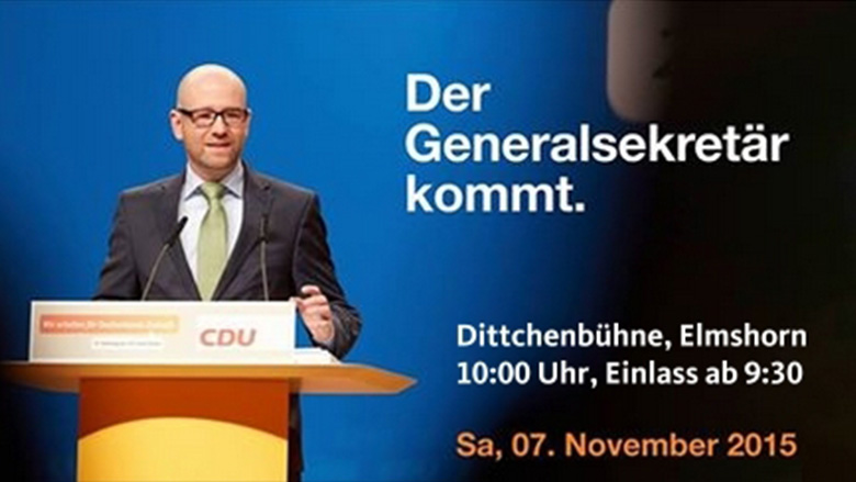 ELMSHORN. Generalsekretär Peter Tauber, MdB, hat den Handlungsbedarf erkannt und mit seiner Kommission "Meine CDU 2017" einen Entwurf für eine Reform der CDU erarbeitet. Bevor der Bundesparteitag im Dezember hierüber berät, haben CDU-Mitglieder bei der CDU Elmshorn die Chance, die Vorschläge ebenso wie andere aktuelle Themen direkt mit Peter Tauber zu diskutieren und zwar am 7. November um 10:00 im Forum Baltikum-Dittchenbühne e.V.Hermann-Sudermann-Allee 50, 25335 Elmshorn.